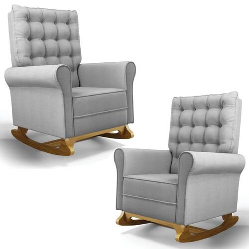 As Poltronas de Balanço são feitas com materiais de alta qualidade, estrutura em madeira de eucalipto, o tecido linho macio e resistente, e a espuma D23 a densidade ideal para o seu conforto, base em madeira com um lindo design e balanço suave, que ajuda a relaxar e a embalar o sono do seu bebê. Além disso, o Kit 2 Poltronas possui um design moderno e sofisticado, com detalhes em botonê revestido no encosto, que dão um toque de charme e elegância ao ambiente.