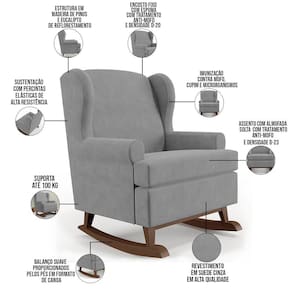 Características: Estrutura em madeira de pinus e eucalipto de reflorestamento, com imunização contra mofo, cupim e microrganismos; Revestimento em Suede Cinza de alta qualidade; Encosto fixo com percintas elásticas, espuma D-23 e tratamento antimofo; Assento com espuma D-20, tratamento antimofo e almofada solta; Sustentação com percintas elásticas de alta resistência; Base com pés em formato de canoa e balanço suave; Peso suportado: Até 100 kg.