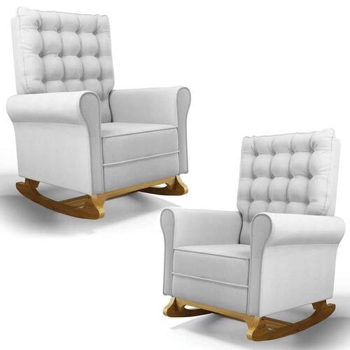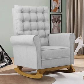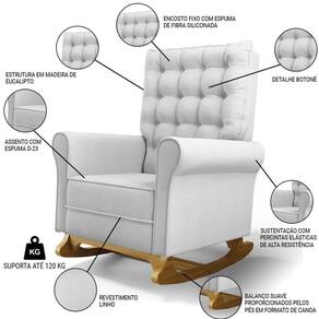 As Poltronas de Balanço são feitas com materiais de alta qualidade, estrutura em madeira de eucalipto, o tecido linho macio e resistente, e a espuma D23 a densidade ideal para o seu conforto, base em madeira com um lindo design e balanço suave, que ajuda a relaxar e a embalar o sono do seu bebê. Além disso, o Kit 2 Poltronas possui um design moderno e sofisticado, com detalhes em botonê revestido no encosto, que dão um toque de charme e elegância ao ambiente.