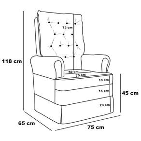 Dimensões do Produto: (L x A x P) Poltrona: 75 x 118 x 65 cm. Puff: 40 x 30 x 40 cm. Peso: Poltrona 29 Kg/Puff 4 Kg.