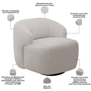 Características: Estrutura em madeira de eucalipto tratada e aparelhada com reforços, cantoneiras e chapas em MDF. Revestimento em tecido Bouclê de alta qualidade na cor Cinza. Encosto curvo fixo composto por espuma soft. Assento curvo fixo composto por espuma D-26 e molas espirais. Percintas elásticas no assento para maior resistência e durabilidade. Braços compostos por espuma D-20. Pés em madeira. Peso suportado: Até 120 kg.