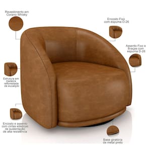 Características: Estrutura em madeira de reflorestamento de eucalipto, pinus e placas de OSB e imunizada contra mofo, cupim e microorganismos. Revestimento em Couríssimo na cor Whisky. Encosto e assento com cintas elásticas de sustentação de alta resistência. Assento, encosto e braças com espuma D-26 e manta acrílica. Base giratória de metal preto. Peso suportado: Até 120 kg.