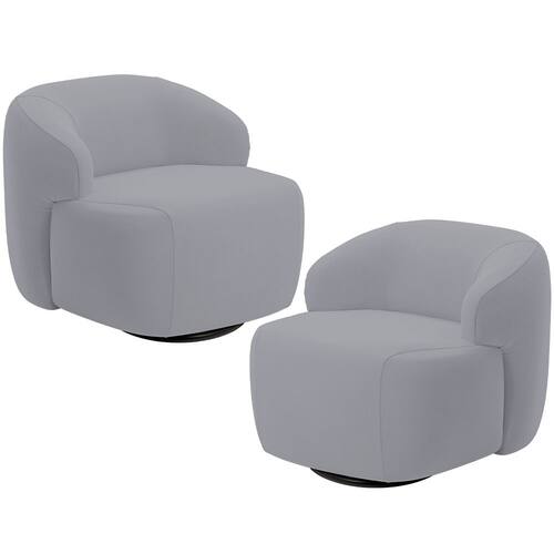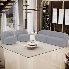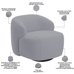 Características: Estrutura em madeira de eucalipto tratada e aparelhada com reforços, cantoneiras e chapas em MDF. Revestimento em Veludo de alta qualidade na cor Cinza. Encosto curvo fixo composto por espuma soft. Assento curvo fixo composto por espuma D-26 e molas espirais. Percintas elásticas no assento para maior resistência e durabilidade. Braços compostos por espuma D-20. Pés em aço giratório. Peso suportado: Até 120 kg.