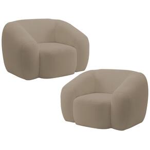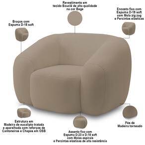 Características: Estrutura em madeira de lei (eucalipto), tratada e aparelhada com reforços de cantoneiras e chapas em OSB. Revestimento em tecido Bouclê de alta qualidade na cor Bege. Assento fixo com espuma D-23 e D-18 soft, molas espirais e percintas elásticas de alta resistência. Encosto fixo com espuma D-18 soft, mola zig zag e percintas elásticas. Braços com espuma D-18 soft. Pés de madeira torneado. Design orgânico para uso em diversos ambientes. Peso suportado: Até 120 kg por assento.