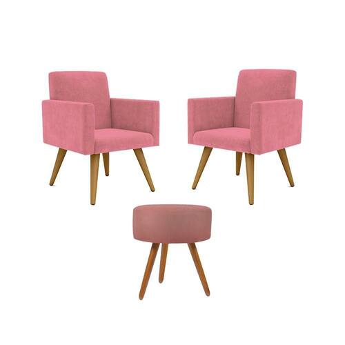 Kit 02 Poltronas Decorativas + Puff Decorativo Redondo Sala Cor:rosa