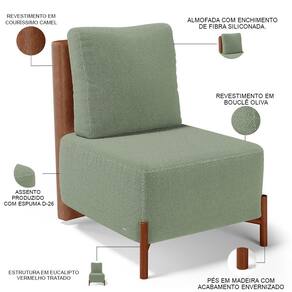 Revestimento do encosto em Couríssimo na cor Camel do assento em Bouclê na cor Oliva, de alta qualidade.