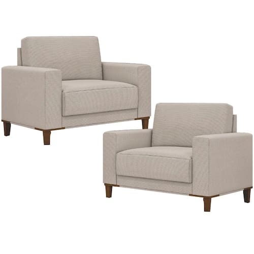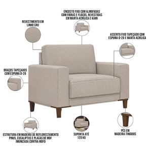 Características: Estrutura em madeira de reflorestamento (pinus, eucaliptus e placas de MDF) imunizada contra mofo, cupim e micro-organismos. Revestimento em tecido Linho de alta qualidade na cor Cru. Assento fixo tapeçados com espuma D-26 e manta acrílica. Encosto fixo com almofadas com fibras e flocos, revestidas com manta acrílica e kami. Braços tapeçados com espuma D-20. Cintas elásticas de alta resistência no assento e encosto para maior sustentação. Pés em madeira tingidos. Peso suportado: Até 120 kg cada.
