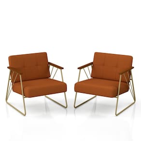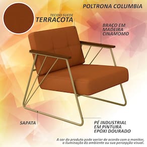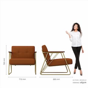 - Detalhes Técnicos das Poltronas - Assento e Encosto Tapeçados, Estofados e Fixos - Espuma do Assento e do Encosto: D20 - Tonalidade Estrutura: Dourado - Tonalidade Estofado: Suede Terracota - Material: Metalon - Medida Poltrona: A:78CM x L:71CM x P:88CM - Altura do assento ao Chão: 42cm - Poltrona suporta até 120KG