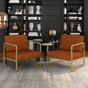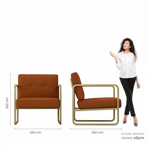 Detalhes Técnicos das Poltronas - Assento e Encosto Tapeçados, Estofados e Fixos - Espuma do Assento e do Encosto: D20 - Tonalidade Estrutura: Dourado - Tonalidade Estofado: Suede Terracota - Material: Metalon - Medida Poltrona: A:80CM x L:69CM x P:68CM - Altura do assento ao chão: 39,5 cm - Poltrona suporta até 120KG