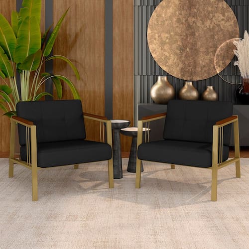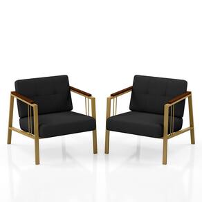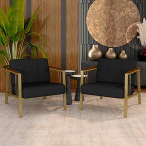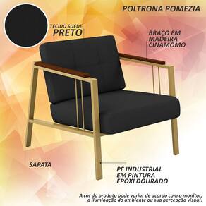 Detalhes Técnicos das Poltronas - Assento e Encosto Tapeçados, Estofados e Fixos - Espuma do Assento e do Encosto: D20 - Tonalidade Estrutura: Dourado -Tonalidade Estofado: Suede Preto - Material: Metalon - Medida Poltrona: A:80CM x L:73CM x P:88CM - Medida Altura do Assento ao chão: 42,10 cm - Poltrona suporta até 120KG