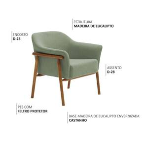 Características Técnicas Estrutura: Madeira reflorestada de eucalipto tratada, com partes em MDF e OSB robustez e sustentabilidade. Assento: Espuma D-28 HR conforto firme e duradouro. Encosto: Espuma D-23 suporte ergonômico ideal. Braço: Espuma D-23 apoio macio e harmonioso. Revestimento: Bouclé visual elegante e fácil manutenção. Base: Madeira de eucalipto envernizada, modelo fixo. Cor da Base: Castanho. Peso Suportado: Até 110 kg sem impacto.