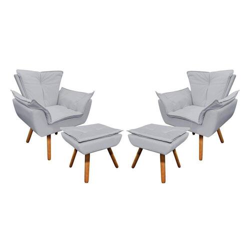 Se você estiver a procura de conforto para leitura e momentos de descanso a Poltrona Opala e o Puff é a melhor escolha. Com estilo inovador e moderno, a Poltrona Opala juntamente com o Puff são um empoderamento visual. Com elegância eles são feitos para preencher o ambiente de aconchego! O seu interior é estruturado em madeira reflorestada de eucalipto e sua base é de MDF reforçada, com pés de madeira castanhos, que dão o apoio necessário para que a Poltrona suporte até 120 kg e o Puff 80 kg. O encosto e o assento são fixos e utilizamos a espuma D-23. Poltrona e Puff Opala são os produtos que faltam em seu ambiente. Dimensões Poltrona: Altura total: 91 cm Largura total: 80 cm Profundidade total: 67 cm Altura do encosto: 46 cm Largura do assento: 40 cm Profundidade do assento: 46 cm Altura do chão ao assento: 46 cm Espessura do assento: 16 cm Tamanho dos pés: 30 cm Altura do chão ao braço: 63 cm Altura interna do braço: 23 cm Espessura do braço: 20 cm Peso: 14 kg 01 Puff: Altura: 45 cm Largura: 50 cm Profundidade: 40 cm Espessura do assento: 15 cm Tamanho dos pés: 30 cm Peso: 5 kg Especificações dos Produtos Estrutura: Madeira Eucalipto Espuma: Prorelax D-23 Tecido: Corino Tipo de pés: Pés palito Peso Suportado: Poltrona até 120 Kg e Puff até 80kg Garantia: 90 dias contra defeito de fabricação Montagem: O produto vai montado, apenas rosquear os pés Instruções de Limpeza: Utilizar um pano limpo e levemente úmido Você irá receber: 02 volumes 02 Poltronas e 02 Puffs Observações Relevantes - Todos os produtos vão embalados com total segurança; - As cores dos produtos podem sofrer alterações dependendo do seu monitor; - Para futuras compras, não garantimos a mesma tonalidade de cor, pois existe variação a cada lote do fabricante do tecido; - As imagens são meramente ilustrativas, não acompanham objetos de decoração e eletros; - Confira as dimensões do produto no momento da compra e certifique-se de que passará normalmente por escadas, elevadores, portas e corredores; - Importante: Por se tratar de estofado as medidas podem ter uma pequena variação em até 3 cm; - Não nos responsabilizamos no ato da entrega por montagens, desmontagens, instalações de produtos; - Não nos responsabilizamos no ato da entrega por subir escadas, elevadores, nem utilização de guinchos ou equipamentos similares para acesso a pisos superiores em apartamentos; - A entrega do produto é realizada em todo território nacional, até onde as rodovias alcançam, entregas fluviais ou aéreas devem ser cotadas a parte; - Observando as orientações acima, evita-se futuros desagrados ou imprevistos com a entrega do produto. Havendo despesas adicionais, serão de responsabilidade do cliente;