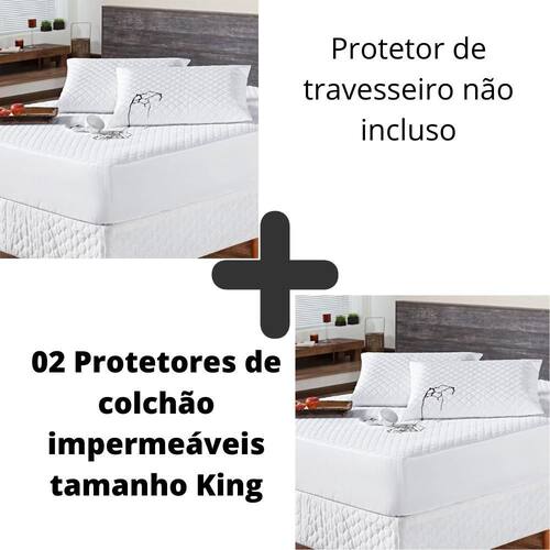 Kit 02 Protetor Colchão Capa Impermeável Branco Cama King O KIT IMPERMEÁVEL MATELADO é o um combo indispensável para sua cama. O protetor irá proteger seu colchão de eventuais acidentes com bebidas, líquidos, sujeira em geral e também da transpiração noturna, o que poderá proporcionar maior vida útil para seu enxoval.