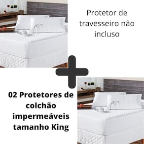 Kit 02 Protetor Colchão Capa Impermeável Branco Cama King O KIT IMPERMEÁVEL MATELADO é o um combo indispensável para sua cama. O protetor irá proteger seu colchão de eventuais acidentes com bebidas, líquidos, sujeira em geral e também da transpiração noturna, o que poderá proporcionar maior vida útil para seu enxoval.