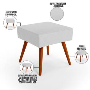 Características: Estrutura em madeira de reflorestamento de eucalipto ou pinus, compensado ou MDF. Revestimento em Linho Cinza de alta qualidade. Assento com espuma D-26. Pés Palito. Montagem prática, apenas rosquear os pés.
