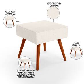 Características: Estrutura em madeira de reflorestamento de eucalipto ou pinus, compensado ou MDF. Revestimento em Linho Cru de alta qualidade. Assento com espuma D-26. Pés Palito. Montagem prática, apenas rosquear os pés.