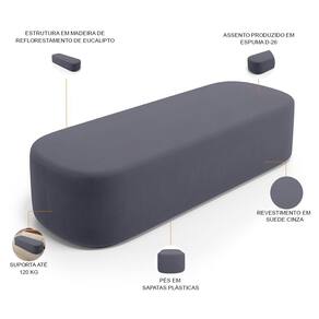 Características: Estrutura em madeira de reflorestamento de eucalipto. Revestimento em Suede na cor Cinza de alta qualidade. Assento com espuma D-26. Peso suportado: Até 120 kg. Pés em sapatas plásticas.