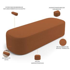 Características: Estrutura em madeira de reflorestamento de eucalipto. Revestimento em Bouclê na cor Terracota de alta qualidade. Assento com espuma D-26. Peso suportado: Até 120 kg. Pés em sapatas plásticas.