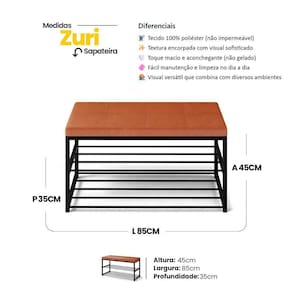Sapateira Calçadeira Multiuso Closet Zuri 85cm: funcional, moderna e projetada para organizar seu ambiente com praticidade. Com estrutura reforçada em metal e assento macio, é perfeita para apoiar, sentar e manter seus calçados sempre à mão. Seu revestimento sintético facilita a limpeza no dia a dia. Equipada com duas prateleiras de metal, a Zuri acomoda diversos pares de sapatos, mantendo tudo organizado e ventilado. Ideal para closets, dormitórios, halls e áreas de circulação, proporcionando conforto ao calçar e elegância na composição do ambiente.