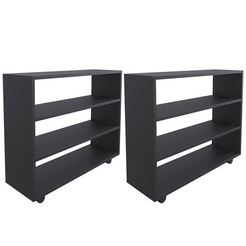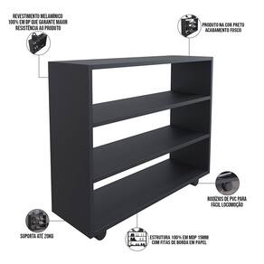 Características: Estrutura 100% em MDP 15mm. Fitas com borda de papel. Revestimento melamínico 100% em BP, que garante maior resistência ao produto. 04 rodízios de PVC para fácil locomoção. Suporta até 20Kg. Altura de 16 cm entre as prateleiras. Produto na Cor Preto, com acabamento Fosco.
