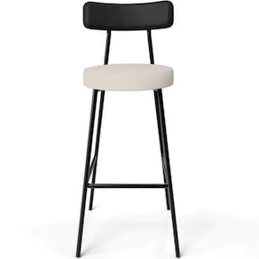 Revestimento do encosto em Couríssimo na cor Preto e assento revestido em Linho na cor Cru, com acabamento semi brilho.