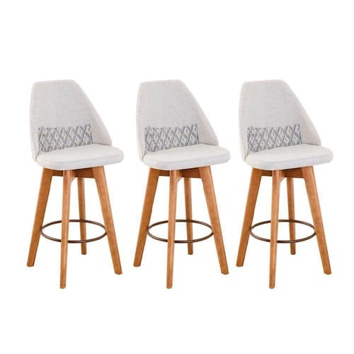 Kit 03 Banquetas Alta Maya Giratória Com Encosto Gourmet Linho Bege E Almofada Zigzag - Aurora Line