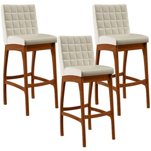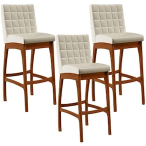 ndo muita excelência, o Kit 03 Banquetas Alta Para Cozinha Sala de Jantar Fixa Mila L02 Facto Pérola Metalizado - Lyam Decor é o complemento que faltava para deixar sua casa ainda mais extraordinária. Seu encosto com costura em padrão quadriculado e assento estofados, centralizam em si uma graciosidade estonteante, sem perder todo o seu conforto. A estrutura em madeira, na cor nozes, também é digna de notoriedade, por imprimir bastante personalidade a sua decoração. Vale ressaltar ainda, o apoio para os pés que garante maior segurança à mesma.