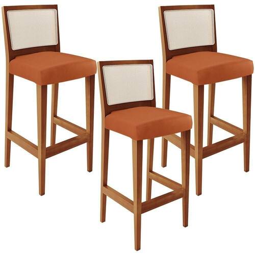 O Kit 03 Banquetas Alta Para Cozinha Encosto em Tela Branco Zion L02 Tecido Terracota - Lyam Decor, possui um estilo rustico que faltava para deixar sua casa ainda mais clássica. Seu encosto com o detalhe de tela sintética na cor branca trazem ainda mais estilo e destaque para sua decoração, junto com assento estofado que proporciona horas de conforto. A estrutura e o apoio para os pés, são responsáveis por garantir maior à mesma. Pode ser acomodada em cozinha americana, ambientes integrados, espaços gourmets, bancadas ou em seu home bar, independente do lugar, ela desperta logo de cara o bom gosto e elegância, deixando tudo mais despojado, perfeita para criar um ambiente harmonioso e agradável para receber a família e amigos, sempre com muita receptividade!