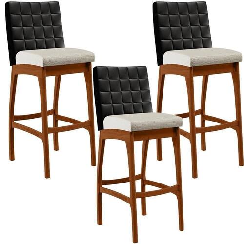 ndo muita excelência, o Kit 03 Banquetas Altas Sala De Jantar Fixa Mila B04 Couríssimo Preto Linho Champagne - Lyam Decor é o complemento que faltava para deixar sua casa ainda mais extraordinária. Seu encosto com costura em padrão quadriculado e assento estofados, centralizam em si uma graciosidade estonteante, sem perder todo o conforto. A estrutura em madeira, na cor nozes, também é digna de notoriedade, por imprimir bastante personalidade a sua decoração. Vale ressaltar ainda, o apoio para os pés que garante maior segurança à banqueta.