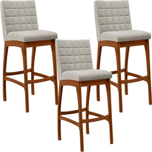 ndo muita excelência, o Kit 03 Banquetas Alta Para Cozinha Sala De Jantar Fixa Mila B04 Bouclê Creme - Lyam Decor é o complemento que faltava para deixar sua casa ainda mais extraordinária. Seu encosto com costura em padrão quadriculado e assento estofados, centralizam em si uma graciosidade estonteante, sem perder todo o conforto, sendo revestidos pelo riquíssimo tecido em bouclê que por si só já é um espetáculo. A estrutura em madeira, na cor nozes, também é digna de notoriedade, por imprimir bastante personalidade a sua decoração. Vale ressaltar ainda, o apoio para os pés que garante maior segurança à mesma.