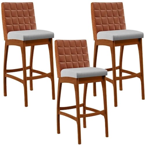 Entregando muita excelência, o Kit 03 Banquetas Altas Cozinha Sala Jantar Fixa Mila B04 Couríssimo Camel Linho Cinza - Lyam Decor é o complemento que faltava para deixar sua casa ainda mais extraordinária. Seu encosto com costura em padrão quadriculado e assento estofados, centralizam em si uma graciosidade estonteante, sem perder todo o conforto. A estrutura em madeira, na cor nozes, também é digna de notoriedade, por imprimir bastante personalidade a sua decoração. Vale ressaltar ainda, o apoio para os pés que garante maior segurança à banqueta.