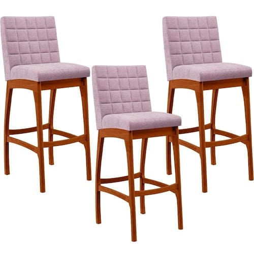 ndo muita excelência, o Kit 03 Banquetas Altas Para Cozinha Sala De Jantar Fixa Mila B04 Bouclê Rosê - Lyam Decor é o complemento que faltava para deixar sua casa ainda mais extraordinária. Seu encosto com costura em padrão quadriculado e assento estofados, centralizam em si uma graciosidade estonteante, sem perder todo o conforto, sendo revestidos pelo riquíssimo tecido em bouclê que por si só já é um espetáculo. A estrutura em madeira, na cor nozes, também é digna de notoriedade, por imprimir bastante personalidade a sua decoração. Vale ressaltar ainda, o apoio para os pés que garante maior segurança à banqueta.
