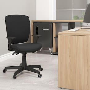 Assento em madeira compensada e estofado em espuma flexível, com coluna a gás e amortecimento de impacto.
