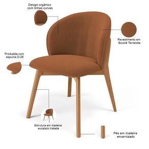 ColorFamily: Laranja | Model: Mia | OriginCountry: | ProductLength: 54 cm | ProductHeight: 81 cm | Material: Estrutura em Madeira, Revestimento em Bouclê e espuma | ColorSimple: Laranja | SupplierSimpleName: Kit 03 Cadeiras de Jantar e Estar Living Estofada Mia L02 Bouclê Terracota - Lyam Decor | Color: Laranja | ProductWarranty: 90 dias após o do produto | ProductWeight: 21 kg | ColorSupplier: Terracota | MaterialFamily: Madeira, Bouclê e espuma | OriginState: PR | ProductContents: 03 Cadeiras | ProductInstructions: Produto para uso em ambiente interno, nao devendo ficar exposto ao sol, calor e umidade excessivos. | ProductWidth: 56 cm | SizeDescription: Altura: 81 cm x Largura: 56 cm x Profundidade: 54 cm
