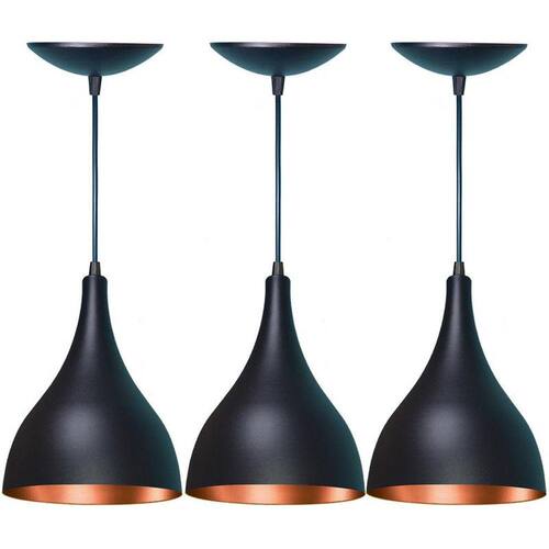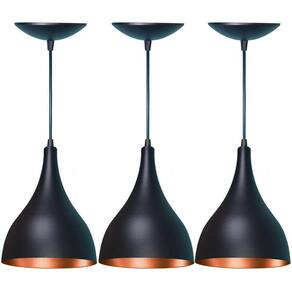 Anúncio referente ao kit de 3 luminárias.Luminária Pendente Gota, fabricada em alumínio, material altamente resistente ao tempo.Luminária composta por cabo PP com 1 metro de comprimento tamanho ajustável , soquete E27, canopla e cúpula em alumínio.Luminária ideal para ambientes internos, utilizada em salas de estar, cozinhas, salas de jantar, área gourmet entre outras.Ilumine e decore o seu lar com nossas lindas luminárias. Deixe a imaginação tomar conta.Lindo pendente para quem gosta de um ambiente com estilo e bem iluminado.Material: Alumínio não enferruja Medidas: 15 cm diâmetro x 18 cm altura mais 1.00 m de caboAltura aproximada montada: 1,18 m Altura ajustável Soquete: E27 aplicável com lâmpada comum ou LED Voltagem: Bivolt 127/220 v Não acompanha: LâmpadaCor Externa: Preta FoscaCor Interna: CobreGarantia: 3 meses de garantia contra defeitos de fabricação. Marca: Estillo & luz