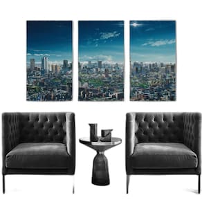 Especificações técnicas Marca: Arte Quadro Modelo: Cidade Grande Quantidade: 03 Material: Tecido canvas 100% algodão Material chassi: Madeira Borda: Infinita Medida de cada quadro: 40 x 70 cm