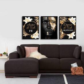 Com o Kit Quadro Decorativo da Quadros On-Line você transforma a decoração do seu ambiente, com beleza e bom gosto. Preencha aquela parede vazia com um quadro de alta qualidade, papel fotográfico brilhante de altíssima resolução e moldura em madeira maciça. Para maior proteção, a peça ainda conta com uma película de acetato. Características:- Papel fotográfico brilhante de altíssima resolução- Película de acetato para proteção da imagem- Moldura em madeira maciça- Pendurador móvel que pode ser retirado facilmente - Pode ser fixado com fita dupla faceEspecificações técnicasMarca: Quadros On-LineQuantidade de quadros:3Modelo: Fé E Gratidão Mulher NegraMaterial: Papel fotográfico brilhante Acabamento: Película de acetato Moldura: Madeira Cor moldura: PretoTamanho cada : 45 x 34 cm - A3Fixação: Prego ou fita dupla face de alta qualidadeAcompanha pendurador: SimGarantia: 3 mesesDica de limpezaA limpeza é feita como um móvel comum da sua casa. Apenas um pano seco ou espanador são suficientes para tal.