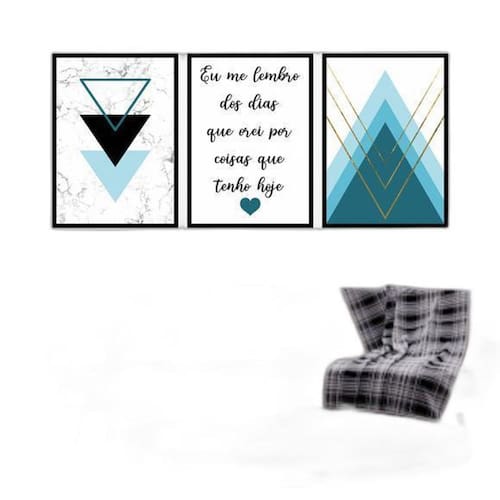 Com o Kit Quadro Decorativo da Quadros On-Line você transforma a decoração do seu ambiente, com beleza e bom gosto. Preencha aquela parede vazia com um quadro de alta qualidade, papel fotográfico brilhante de altíssima resolução e moldura em madeira maciça. Para maior proteção, a peça ainda conta com uma película de acetato. Características: - Papel fotográfico brilhante de altíssima resolução - Película de acetato para proteção da imagem - Moldura em madeira maciça - Pendurador móvel que pode ser retirado facilmente - Pode ser fixado com fita dupla face Especificações técnicas Marca: Quadros On-Line Quantidade de quadros:3 Modelo: Geométrico Eu Lembro Turquesa Material: Papel fotográfico brilhante Acabamento: Película de acetato Moldura: Madeira Cor moldura: Preto Tamanho cada : 45 x 34 cm - A3 Fixação: Prego ou fita dupla face de alta qualidade Acompanha pendurador: Sim : 3 meses Dica de limpeza A limpeza é feita como um móvel comum da sua casa. Apenas um pano seco ou espanador são suficientes para tal.