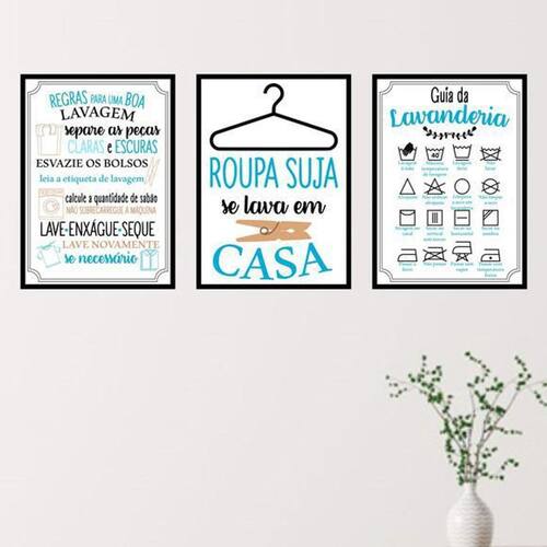 Kit 03 Quadros Decorativos Lavanderia Azul 45x34Cm