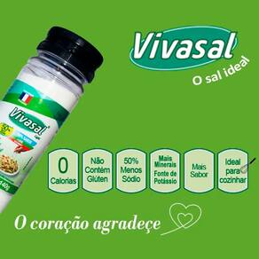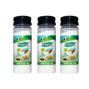 Kit 03 Unidades 140g Vivasal Light Gourmet 50% Menos SódioO kit Contém:03 x Vivasal 50 Light Gourmet - Saleiro de Mesa 140g Sal light reduzido em sódio 50% e enriquecido em potássio e mais minerais.Uma composição mineral equilibrada e saborosa para cozinhar e temperar sua comida de maneira saudável para toda a família.O único sal light com sabor realmente igual ao sal comum, você vai se surpreender! VIVASAL 50, o sal light gourmet reduzido em sódio 50% para muitos benefícios no seu dia a dia.Redução 50%, a taxa de redução ideal para controlar e manter seu consumo de sódio ao nível recomendado para uma alimentação mais saudável.Mais minerais para auxiliar sua dieta. Enriquecido em potássio em proporção equilibrada para aumentar seu consumo deste mineral importante para nosso equilíbrio nutricional e a para a saúde. Mistura de minerais - Zero calorias - Não contem glúten, Não contem glutamato, Não contem aromas Sabor igual ao do sal comum para não perder nada do gosto da sua comida e do sucesso da suas receitas em casa!Usar no dia a dia na cozinha e na comida para toda a família em substituição do sal comum nas mesmas proporções.