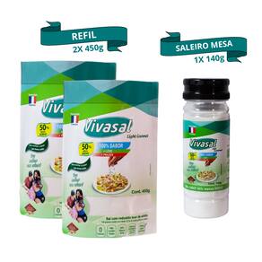 Kit 03 Unidades Vivasal 50 Light GourmetO kit Contém:02 x Vivasal 50 Light Gourmet - Refil 450g01 x Vivasal 50 Light Gourmet - Saleiro de Mesa 140g Sal light reduzido em sódio 50% e enriquecido em potássio e mais minerais.Uma composição mineral equilibrada e saborosa para cozinhar e temperar sua comida de maneira saudável para toda a família.O único sal light com sabor realmente igual ao sal comum, você vai se surpreender! VIVASAL 50, o sal light gourmet reduzido em sódio 50% para muitos benefícios no seu dia a dia.Redução 50%, a taxa de redução ideal para controlar e manter seu consumo de sódio ao nível recomendado para uma alimentação mais saudável.Mais minerais para auxiliar sua dieta. Enriquecido em potássio em proporção equilibrada para aumentar seu consumo deste mineral importante para nosso equilíbrio nutricional e a para a saúde. Mistura de minerais - Zero calorias - Não contem glúten, Não contem glutamato, Não contem aromas Sabor igual ao do sal comum para não perder nada do gosto da sua comida e do sucesso da suas receitas em casa!Usar no dia a dia na cozinha e na comida para toda a família em substituição do sal comum nas mesmas proporções.