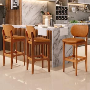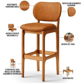 Amplamente sofisticada, o Kit 4 Banquetas Alta Para Cozinha Fixa Betta L02 Imbuia Couríssimo Canela - Lyam Decor irá agregar ainda mais valor em sua decoração!! Sendo capaz de compor muito bem o ambiente, é produzida com materiais de excelente qualidade, a resistente estrutura em madeira de Taeda, na cor imbuia, conta com apoio para os pés (que garante maior segurança), além do assento e encosto estofados super confortáveis e convidativos, que são revestidos em tecido Couríssimo, extremamente elegante.