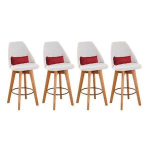 Kit 04 Banquetas Alta Maya Giratória Com Encosto Linho Bege Claro E Almofada Corino Vermelho - Aurora Line
