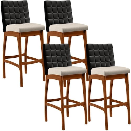ndo muita excelência, o Kit 04 Banquetas Altas Cozinha Sala De Jantar Fixa Mila B04 Couríssimo Preto Linho Cru - Lyam Decor é o complemento que faltava para deixar sua casa ainda mais extraordinária. Seu encosto com costura em padrão quadriculado e assento estofados, centralizam em si uma graciosidade estonteante, sem perder todo o conforto. A estrutura em madeira, na cor nozes, também é digna de notoriedade, por imprimir bastante personalidade a sua decoração. Vale ressaltar ainda, o apoio para os pés que garante maior à banqueta.