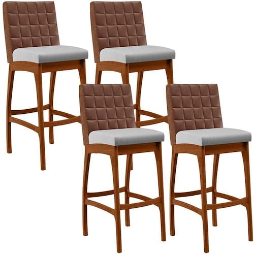 ndo muita excelência, o Kit 04 Banquetas Altas Cozinha Sala Jantar Fixa Mila B04 Couríssimo Marrom Linho Cinza - Lyam Decor é o complemento que faltava para deixar sua casa ainda mais extraordinária. Seu encosto com costura em padrão quadriculado e assento estofados, centralizam em si uma graciosidade estonteante, sem perder todo o conforto. A estrutura em madeira, na cor nozes, também é digna de notoriedade, por imprimir bastante personalidade a sua decoração. Vale ressaltar ainda, o apoio para os pés que garante maior segurança à banqueta.