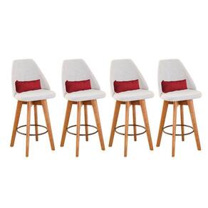 Kit 04 Banquetas Alta Maya Giratória Com Encosto Gourmet Linho Bege E Almofada Sintético Vermelho - Gat Magazine Banqueta Maya Giratória - GAT MAGAZINE A Banqueta Maya possui assento e pés em madeira eucalipto com sistema giratório! Os pés contam com um reforço que proporciona um suporte de peso de até 120 Kgs.O assento é revestido com espuma D-23. Além de bonita e charmosa, vai trazer para seu ambiente elegância e proporcionará conforto para sua família e amigos nos momentos de lazer.