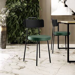 Revestimento do encosto em Couríssimo na cor Preto e do assento em Facto na cor Verde Musgo, com acabamento semi brilho.