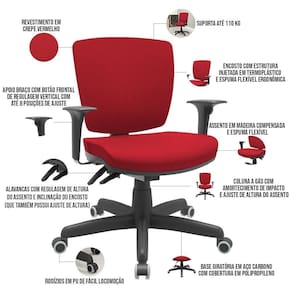 O Kit 04 Cadeiras Executiva Giratória Flexi , é uma opção robusta e elegante para um ambiente de trabalho confortável. Essa cadeira combina elementos de design moderno e materiais duráveis para oferecer suporte ergonômico e resistência ao uso diário. Projetada para uso em ambientes de trabalho, essas cadeiras são conhecidas por sua estabilidade e durabilidade. O encosto baixo e assento estofado são características importantes dessa cadeira, pois fornecem apoio e conforto adicional para a lombar e ajudam a manter uma postura correta durante o período de ofício, é uma escolha funcional e esteticamente agradável para um ambiente de trabalho. Com seu design ergonômico, materiais resistentes e conforto adicional, essa cadeira oferece suporte adequado e durabilidade para enfrentar as demandas evitando assim o desconforto e fadiga ao longo do dia a dia no escritório. Além disso, apresenta recursos como altura ajustável, braços com regulagem vertical e rodízios para facilitar a movimentação ao redor do escritório. Adquira mais conforto para suas horas de trabalho! Dimensões do produto (L x A x P) 64 cm x 83 cm x 54 cm Medidas internas: Profundidade assento: 45 cm Largura assento: 49 cm Altura encosto: 41,1 cm Altura do chão ao assento: 45,8 á 56,6 cm Largura do encosto: 44 cm Características: Cadeira executiva, encosto com estrutura injetada em termoplástico. Apoio para braço com botão frontal de regulagem vertical, com até 8 posições de ajuste. Assento em madeira compensada e estofado em espuma ível, com coluna a gás e amortecimento de impacto. Possui alavancas de regulagem de altura do assento e inclinação do encosto. Revestimento em Poliéster na cor Vermelho. Base giratória em Aço de Carbono com cobertura em polipropileno. Rodízios em PU de fácil locomoção. Possui certificado NR-17. Suporta até 120 kg. - Por se tratar de estofado as medidas podem ter uma pequena variação de até 3 cm. - A tonalidade do produto real poderá ter ligeira variação devido o lote de tecidos. Observações importantes: - A montagem será de responsabilidade do comprador; - Responsabilizamo-nos pela em todo território , até onde as rodovias alcançam, fluviais ou aéreas devem ser cotadas a parte; - Não nos responsabilizamos, no ato da , por subir escadas/elevadores ou por guincho em apartamentos. - Eventuais despesas são de responsabilidade do comprador; - Confira as dimensões do produto e certifique-se de que passará normalmente por supostos elevadores, portas, escadas e/ou corredores de sua residência; ProductLength: 67 cm | ProductWeight: 40 kg | ProductContents: 04 Cadeiras de Escritório | MaterialFamily: Madeira | ProductWarranty: 90 dias após o do produto | SupplierSimpleName: Kit 04 Cadeiras de Escritório Executiva Giratória Preto Baixa Flexi P03 Poliéster Vermelho - Lyam | OriginCountry: | ProductInstructions: Produto para uso em ambiente interno, nao devendo ficar exposto ao sol, calor e umidade excessivos. | ProductHeight: 84 cm | OriginState: PR | SizeDescription: Altura: 84 cm Largura: 65 cm Profundidade: 67 cm | Color: Vermelho | ColorFamily: Vermelho | ColorSimple: Vermelho | ColorSupplier: Vermelho | Model: Flexi | Material: Madeira, espuma | ProductWidth: 65 cm