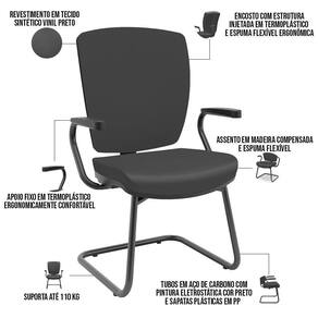 Kit 04 Cadeiras De Escritório Fixa Executiva Office Preto Slim Alta Flexi P03 Vinil Preto - Lyam O Kit 04 Cadeiras de Escritório Flexi, é uma opção robusta e elegante para um ambiente de trabalho confortável. Essa cadeira combina elementos de design moderno e materiais duráveis para oferecer suporte ergonômico e resistência ao uso diário. Projetada para uso em ambientes de trabalho, como escritórios ou salas de estudo, essas cadeiras são conhecidas por sua estabilidade e durabilidade. O encosto alto e assento estofado são características importantes dessa cadeira, pois fornecem apoio e conforto adicional para a região lombar e ajudam a manter uma postura correta durante o período de ofício, é uma escolha funcional e esteticamente agradável para um ambiente de trabalho. Com seu design ergonômico, materiais resistentes e conforto adicional, essa cadeira oferece suporte adequado e durabilidade para enfrentar as demandas evitando assim o desconforto e fadiga ao longo do dia a dia no escritório. Adquira mais conforto para suas horas de trabalho! Dimensões do produto (L x A x P) 64 cm x 100 cm x 55 cm Medidas internas: Profundidade assento: 42,3 cm Largura assento: 49 cm Altura encosto: 52 cm Altura do chão ao assento: 64,3 cm Largura do encosto: 49 cm Características: Cadeira fixa de diálogo, com encosto e apoio com estrutura injetada em termoplástico. Assento em madeira compensada e estofado em espuma flexível, de alta resiliência e alta densidade. Revestimento em Vinil na cor Preto. Base em Aço de Carbono com pintura eletrostática, na cor preto. Sapatas Plásticas injetadas em polipropileno, 100% reciclável. Suporta até 110 kg. - Por se tratar de estofado as medidas podem ter uma pequena variação de até 3 cm. - A tonalidade do produto real poderá ter ligeira variação devido o lote de tecidos. Observações importantes: - A montagem será de responsabilidade do comprador; - Responsabilizamo-nos pela entrega em todo território nacional, até onde as rodovias alcançam, entregas fluviais ou aéreas devem ser cotadas a parte; - Não nos responsabilizamos, no ato da entrega, por subir escadas/elevadores ou transporte por guincho em apartamentos. - Eventuais despesas são de responsabilidade do comprador; - Confira as dimensões do produto e certifique-se de que passará normalmente por supostos elevadores, portas, escadas e/ou corredores de sua residência; NA