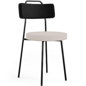 Revestimento do encosto em Couríssimo na cor Preto e do assento em Linho na cor Bege, com acabamento semi brilho.